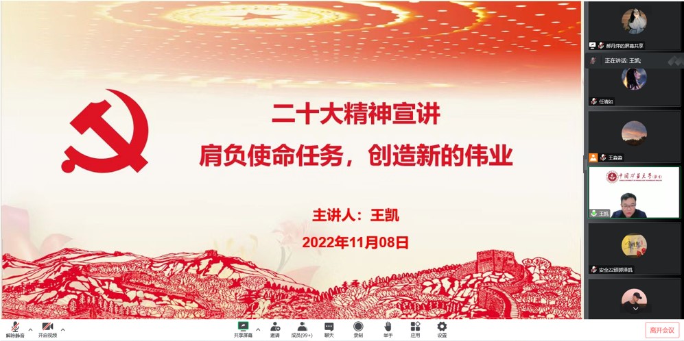 2022年11月8日,我院党委书记王凯以“肩负使命任务,创造新的伟业”为题开展主题党课,进行二十大精神宣讲,全院300余名党员和积极分子线上聆听党课。