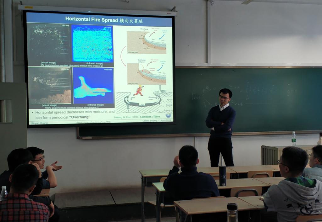 交流活动中,黄鑫炎副教授作了“泥炭的阴燃与地球的可燃极限”的主题报告,系统介绍了泥炭阴燃火的来源、与明火的差别以及对全球气候和环境的影响,全面分析了泥炭火动力学,包括泥炭阴燃的化学反应过程、数值模拟、泥炭火蔓延实验、地球的可燃极限。