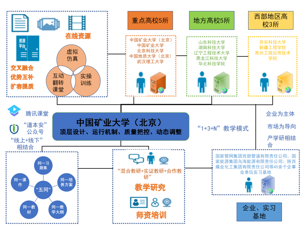 本次获批建设的“安全系统工程学课程虚拟教研室”依托于中国矿业大学(北京)安全科学与工程国家A+学科、国家级一流专业建设点、国家安全科学与工程研究院等优势平台。教研室担负着组织、领导和管理安全系统工程学等相关课程建设任务。经过多年教研协同发展初步形成了“国际知名、国内领军、多元合作、协同发展”的教研格局。教研室坚持进行学期工作计划与总结,定期开展教学理论、教学内容与方法改革的研究,交流教学经验,探讨提高人才培养质量方法,打造“带培”制度,积极帮助新教师;提出“五同”标准化教学体系,改革虚拟化实践教学模式方法,寓前瞻性研究成果于教学,深化大安全系统的交叉互融性。基于“腾讯课堂”、“道本安”微信公众号、移动端直播平台的视频直播等方式,将开展“线上+线下”的协同教研,搭建移动泛在的教研交流空间,创新教学形态、共建优质资源,建立标准的虚拟教研室运行管理制度在虚拟教研室合作单位适用引领,并向全国所有设置安全系统工程类课程的院校推广应用,将本虚拟教研室建成全国一流的示范教研室。
