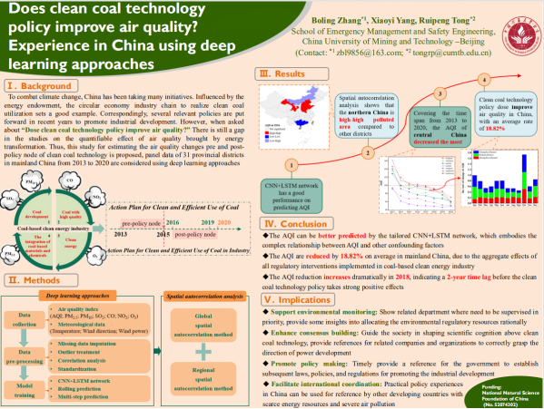 张渤苓已连续参与三届MIT A+B国际研讨会,在之前的会议中曾对中国清洁煤技术政策实施前后空气质量变化趋势等研究成果进行介绍,该项研究工作近期以“Air quality changes in China 2013-2020: Effectiveness of clean coal technology policies”为题发表于国际权威期刊Journal of Cleaner Production(SCI JCRQ1/中科院一区,2021-2022最新影响因子11.072)。佟瑞鹏教授为通讯作者,中国矿业大学(北京)应急管理与安全工程学院为第一单位。