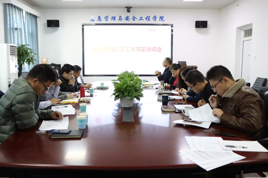 会议就我院校庆日活动前期筹备工作和各项工作的进展情况进行了沟通,就学院校庆日开展的“安全学科创新发展研讨会”、“安全学科人才培养方案研讨会”和“校友代表座谈会”三项活动的相关事宜、物资发放、现场布置等校庆相关工作进行讨论。会议最终确定了我院返校校友名单,校庆日开展活动的时间安排、具体流程及相关人员配备,并对校庆日的物资发放、志愿服务等工作作出部署。