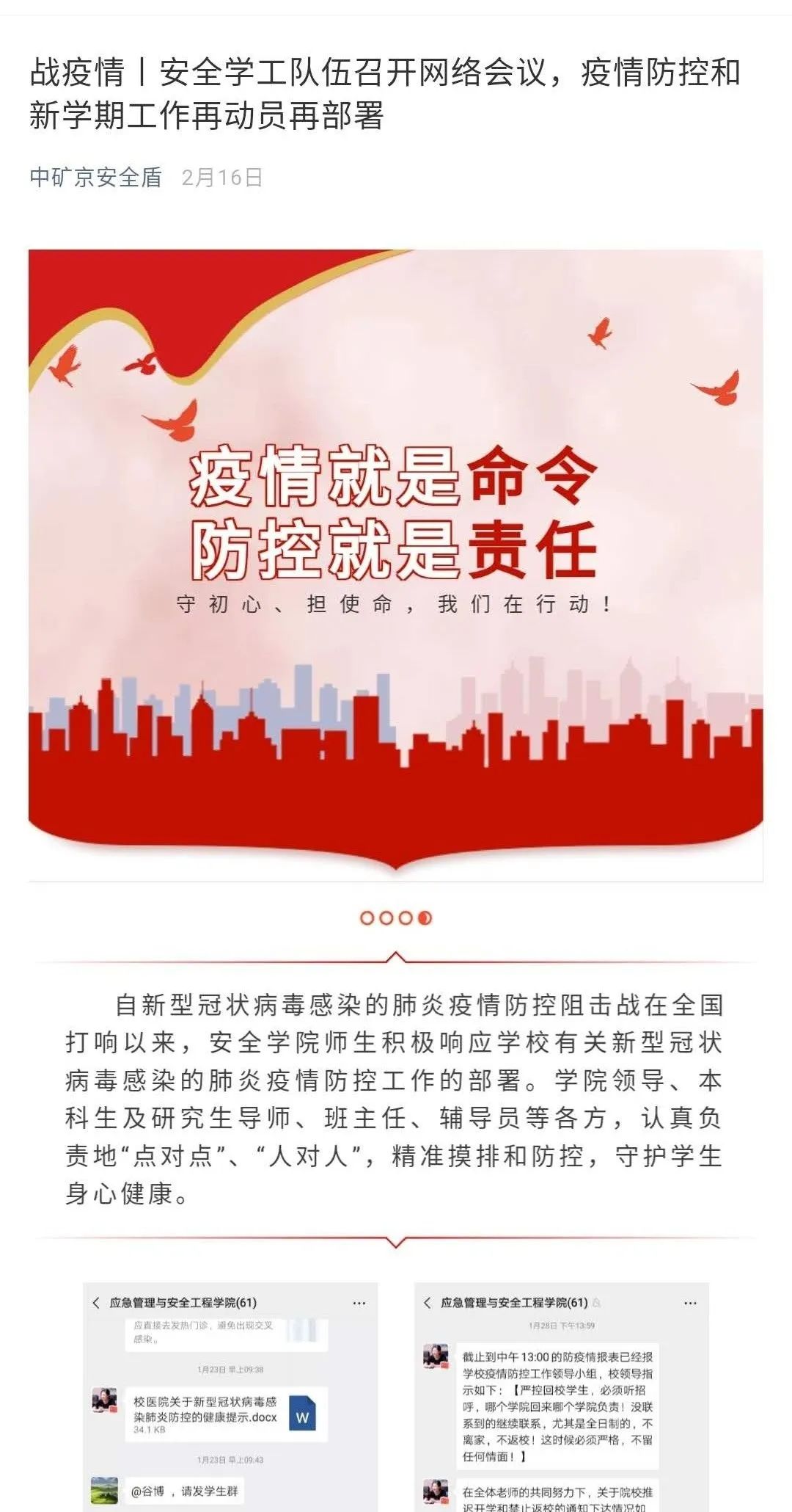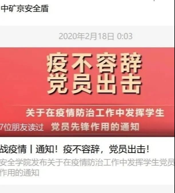 疫情发生以来,应急管理与安全工程学院积极响应党中央、国务院统一部署,深入贯彻落实《中国矿业大学(北京)新型冠状病毒感染的肺炎疫情防控工作方案》,迅速成立学院学生疫情防控工作组,充分动员辅导员、班主任、导师和学生骨干力量,构筑信息摸排、思政教育、舆论宣传、多方动员、党员先锋、就业服务六位一体防控体系,多角度全方位做好疫情防控。