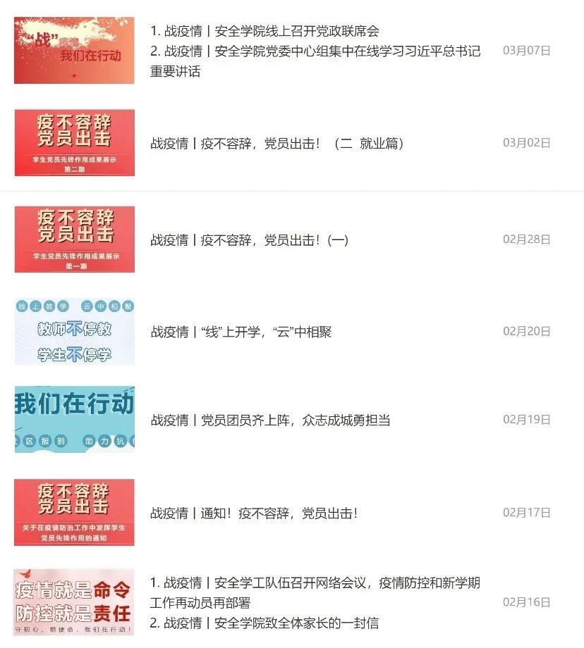 随着疫情防控形势的发展和变化,安全学院在第一时间组织召开疫情防控工作领导小组会议、各口专题会议,传达学习习近平总书记重要讲话精神,就学院疫情防控工作再部署再推进再落实。组织本科生/研究生导师、班主任、辅导员形成“点-线-面”立体工作阵列,通过公众号、官方网站、微信群、QQ等方式全方位将北京市和学校防疫相关通知及要求对学生进行立体宣传。发布“通知!疫不容辞,党员出击!”“安全学工队伍召开网络会议,疫情防控和新学期工作再动员再部署”“安全学院召开线上党政联席会”等推文,落实学校和上级有关部门政策要求,宣传科学防控。