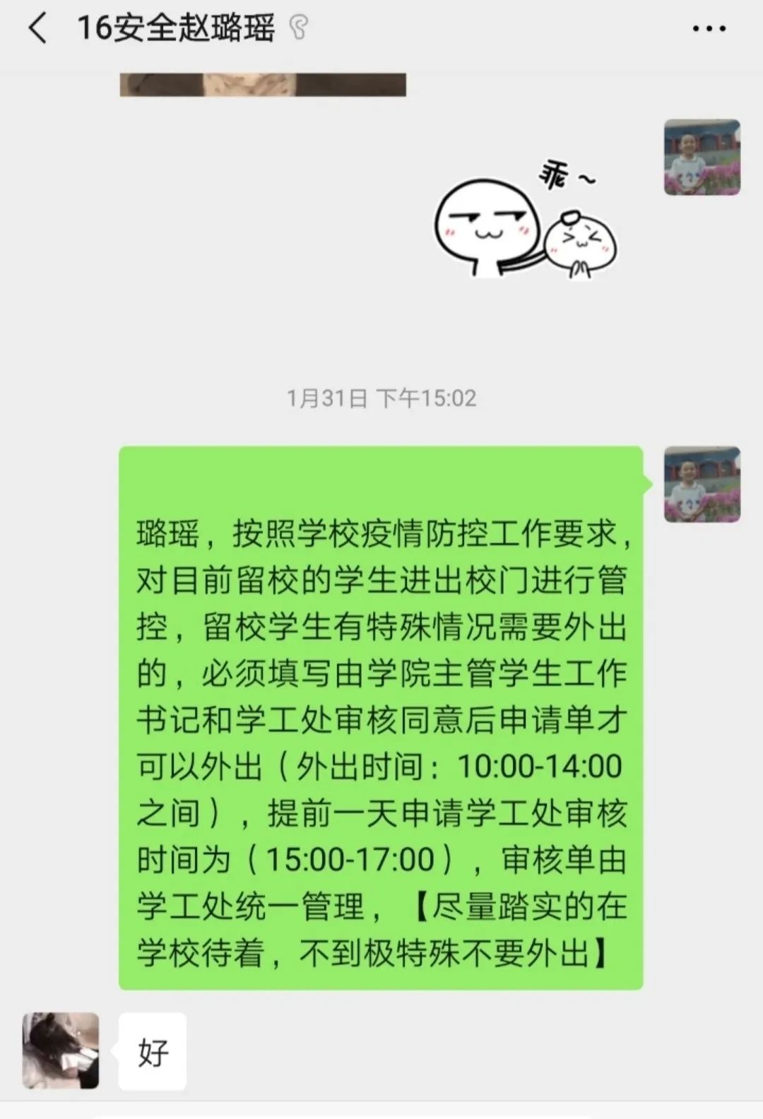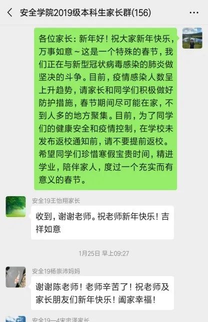1月22日,安全学院第一时间进入“战时状态”,辅导员“休假不休班”24小时在线在岗,1月25日完成向全院991名各类学生发送学校延期开学、学生稳控在家的通知。院党委副书记谷博对各项工作提出了“一个不落”的总体目标和“一对一”“点对点”的具体举措,辅导员依托网络和电话办公,对全体学生行程轨迹和健康状况进行了全面细致的摸排,对重点地区、重点类别学生进行信息核查,加强关注。通过摸排,进一步确保学生沟通渠道畅通,将疫情防控信息第一时间通知到所有学生和家长,守护学生身心健康。