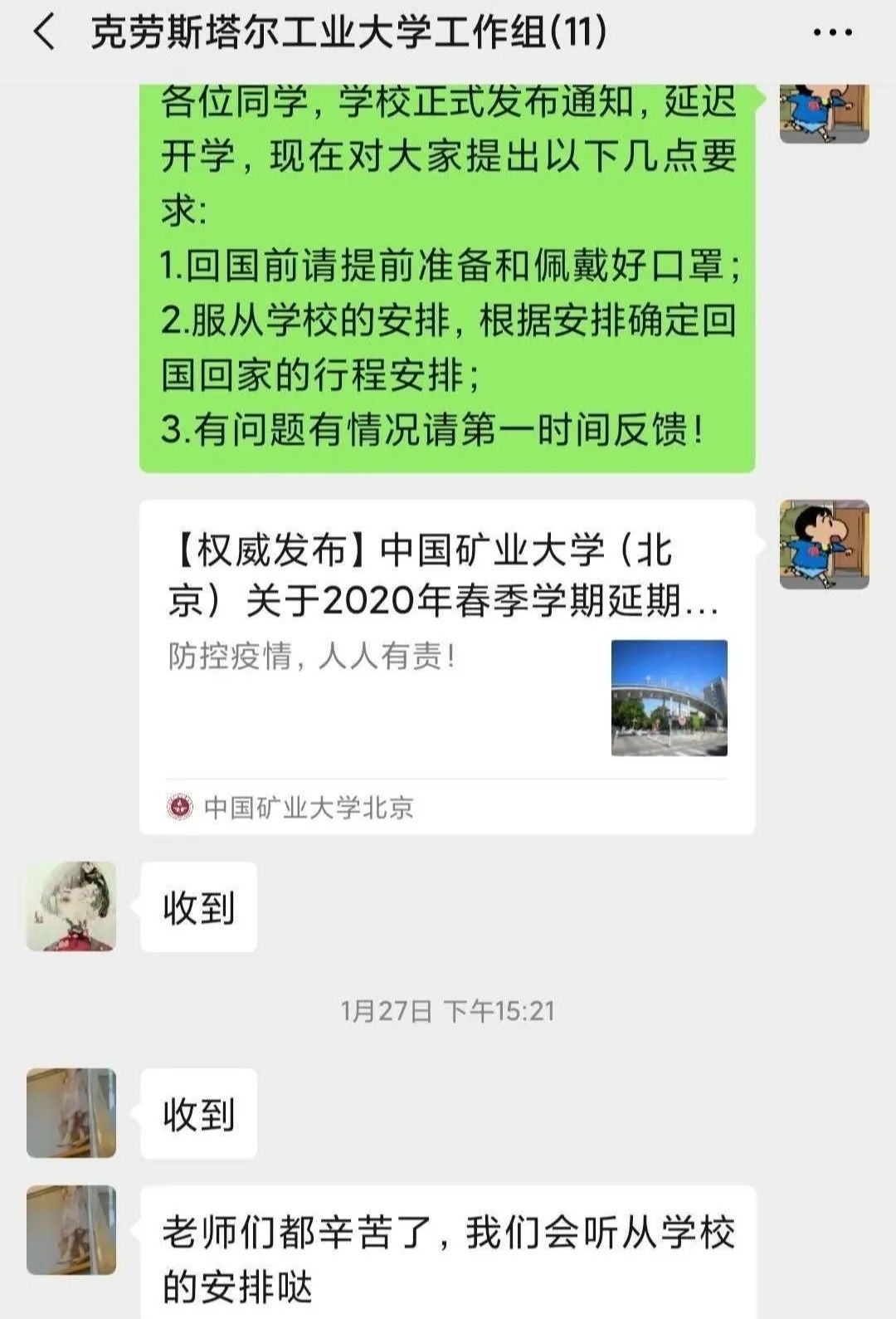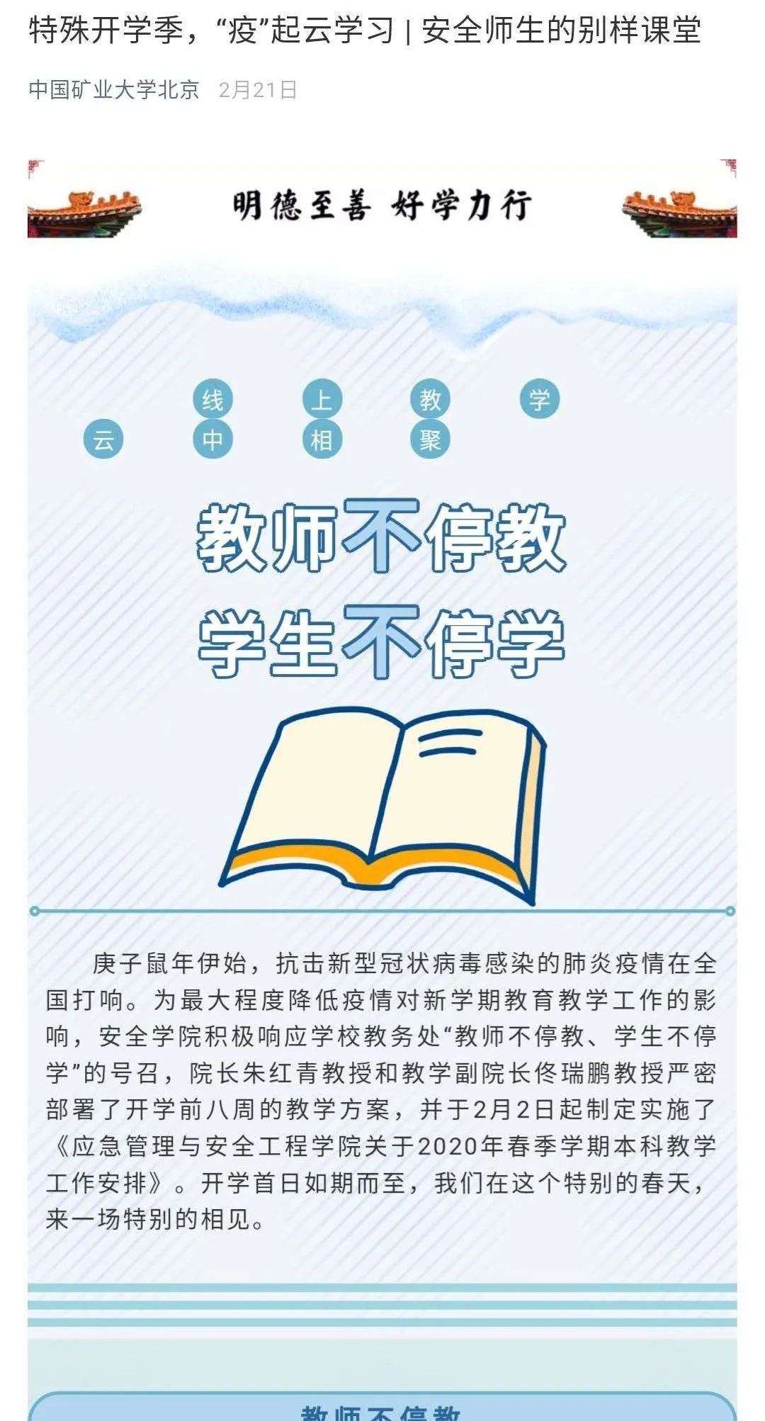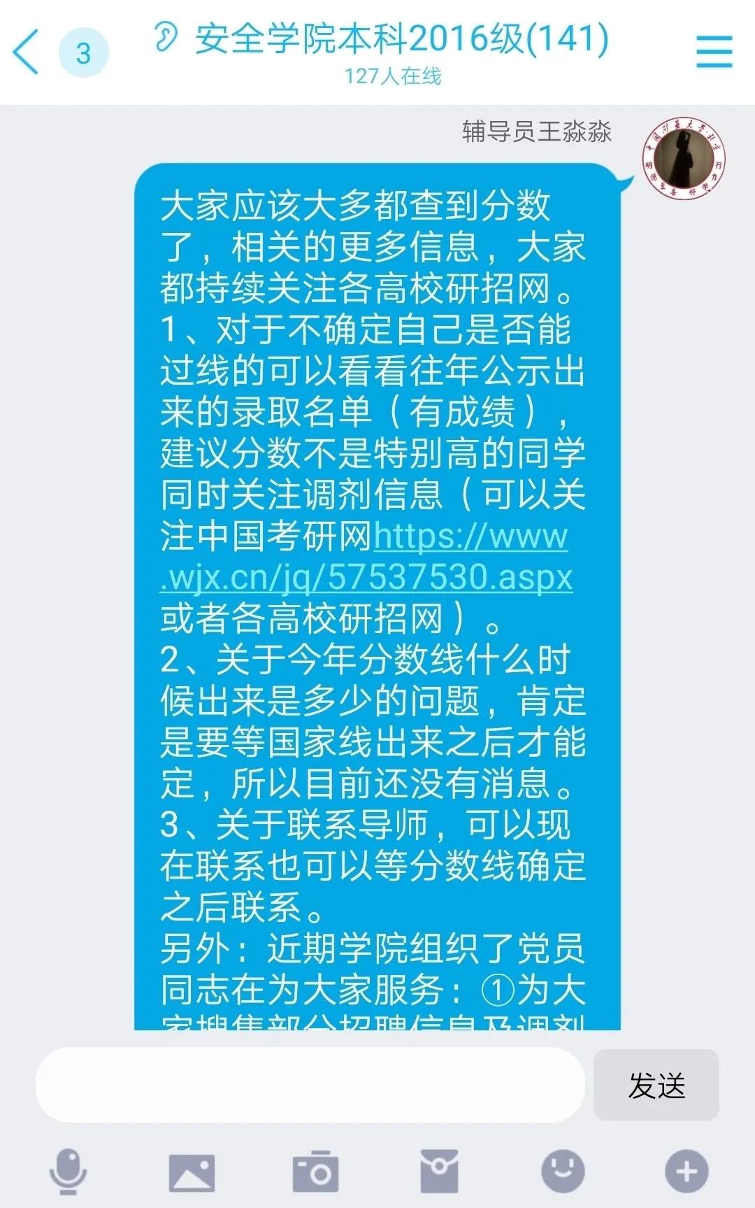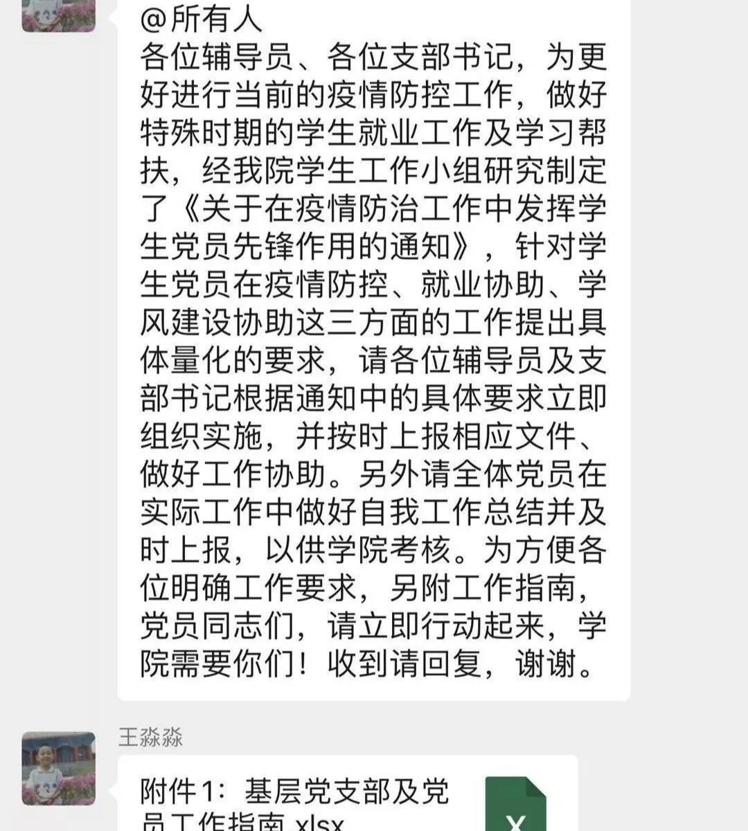 教师们行动起来了。作为导师、班主任的他们,协助辅导员安抚学生情绪、关注学生心理健康,发布学校疫情防控政策和工作安排,做好学生稳控工作。他们提供就业信息,为学生推荐就业岗位,搜集考研调剂信息。同时认真准备,做好线上复课复学。