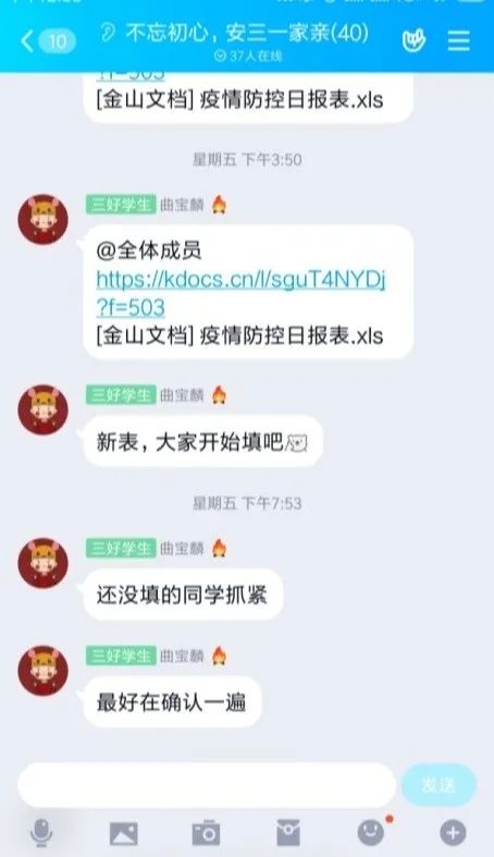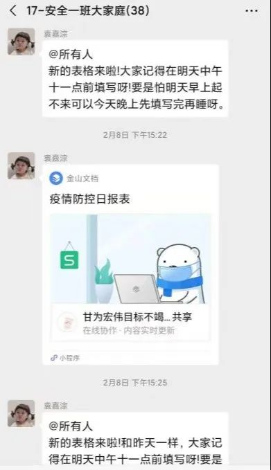 在疫情初期,准确无误地统计和上报每一名学生的健康和行程信息是疫情防控的基础,学院辅导员创新工作手段,通过WPS共享文档协作编辑形成全体学生“日报表”制度,对学生的健康信息和行程安排进行实时监控,并形成了“辅导员-班干部-宿舍长”的信息填报监督网络,督促每一名同学按时、按要求地完成好信息填报工作。同时通过专人跟进,确保非全日制研究生能够准时签到,如实掌握基础数据。