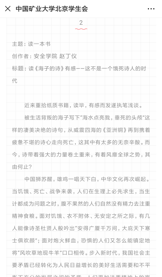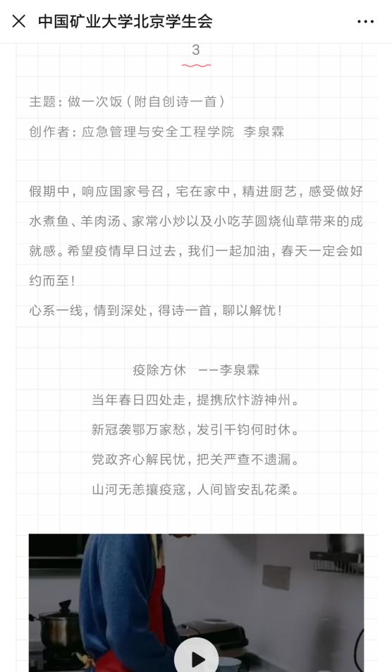 学院通过“履行一份承诺、写一封信、读一本书、做一道菜、健一次身”活动,引导学生形成健康向上的世界观、人生观和价值观,并在这些活动当中思考、感悟和提升。活动取得了良好的效果,学生的20余篇作品被学校公众号展示。