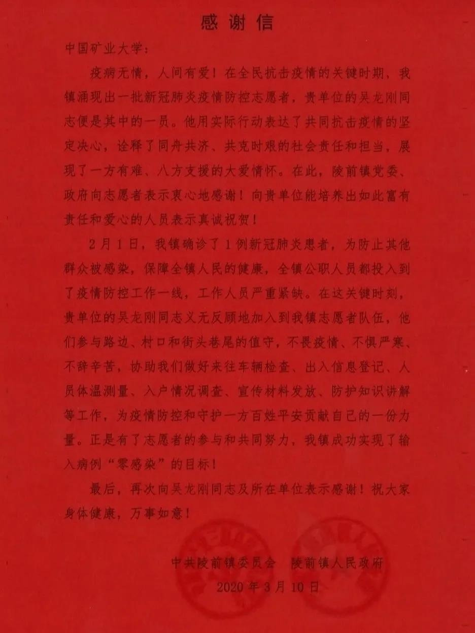 3月22日,学校收到一封来自陕西省咸阳市陵前镇党委的感谢信。硕士17级吴龙刚同学,在家乡咸阳市陵前镇,踊跃参与疫情防控,在执勤岗位上检查来往车辆、登记出入信息、测量体温、入户调查、讲解防护知识。他表示作为一名共产党员,他会用实际行动响应党和国家的号召,为打赢疫情防控阻击战贡献自己的力量。我院党员在此次疫情中展现出的使命感和责任心,赢得了社会各界的一致好评。