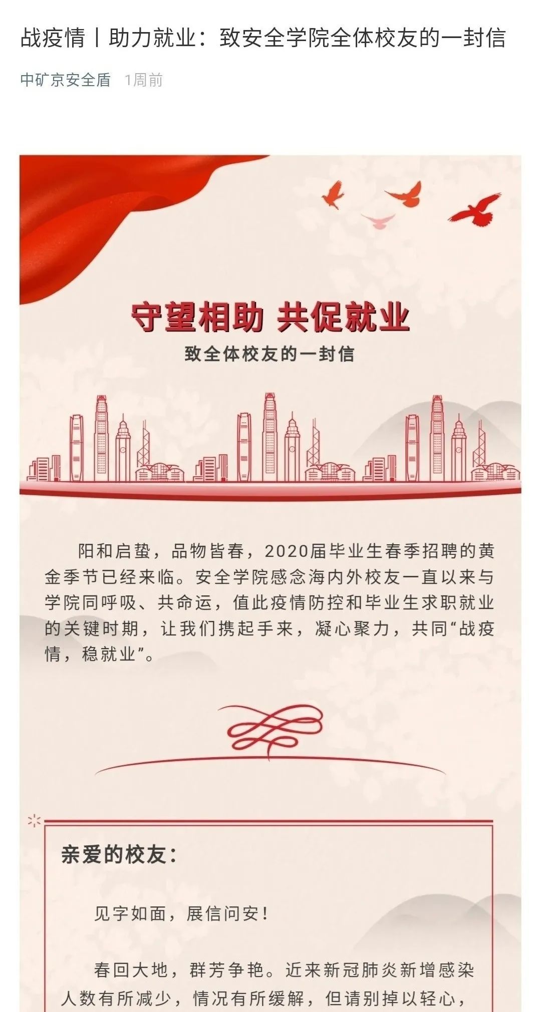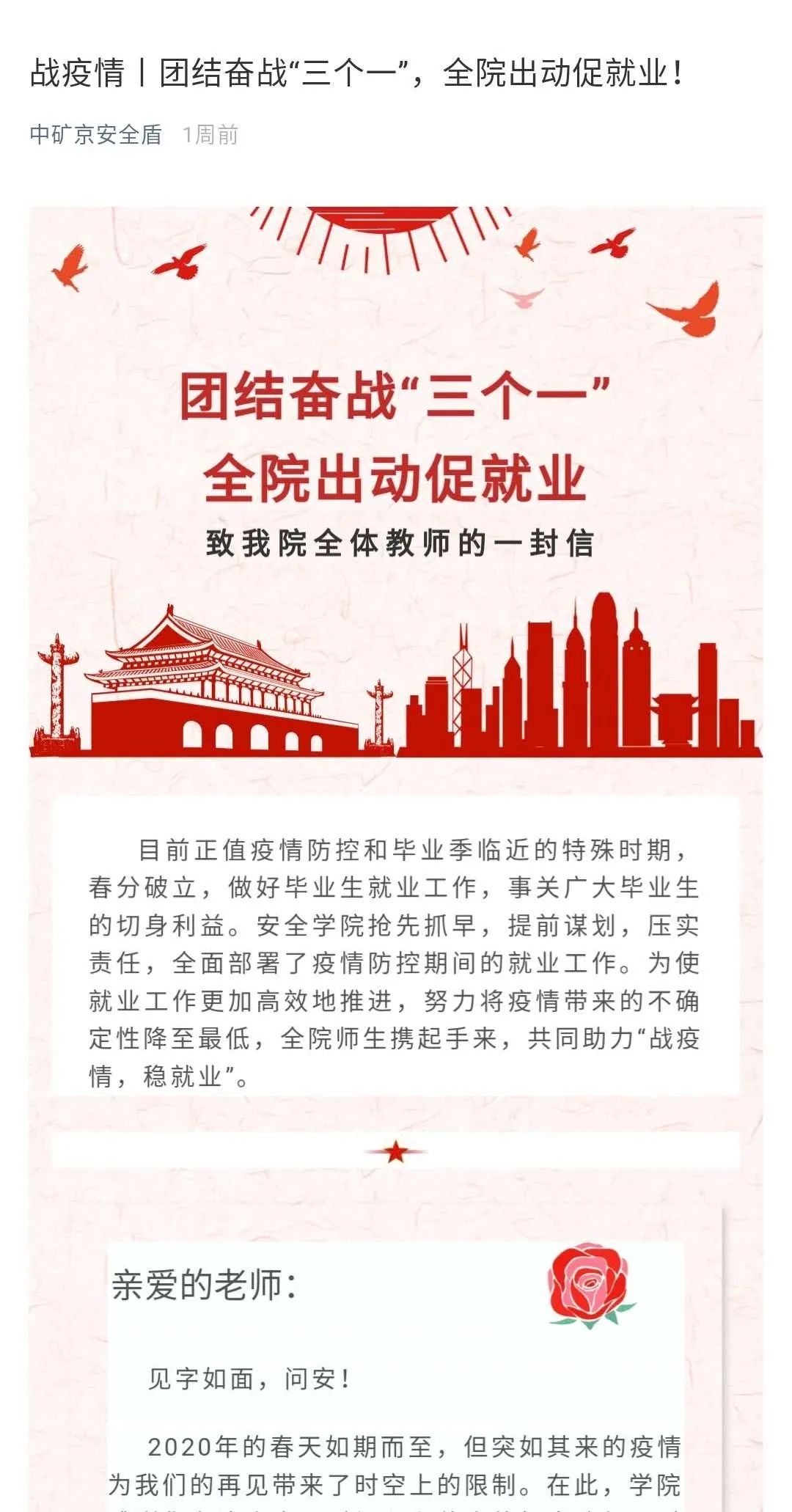 四封情真意切的信件,送予学院教师、家长、校友和用人单位,传递着我们诚挚的问候和热切的期盼。我们问候着收信人见字如面,展信如晤;我们期待着跨越冬天和春天的久别重逢和彼此崭新的明天。