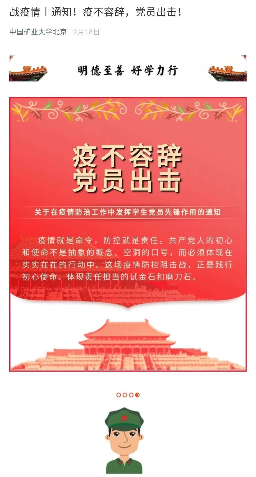 学院号召学生党员、团员敢于担当、勇于担当,要求到社区(村)报到,承担力所能及的防疫工作,带头听从当地政府召唤,有序参与疫情联防联控,为构筑疫情防控的人民防线贡献青春力量,彰显大学生的精神面貌和责任担当。