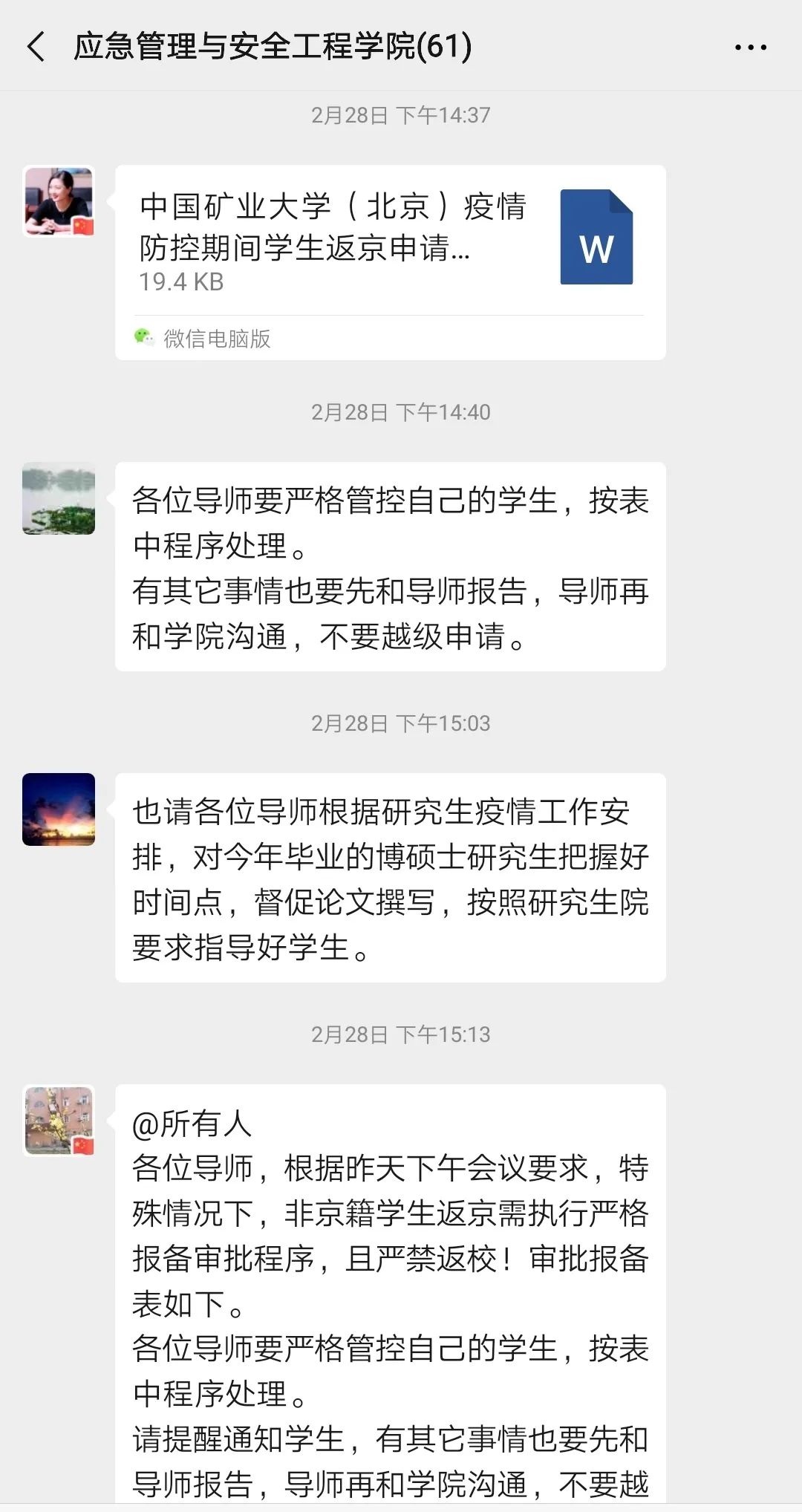 在疫情防控过程中,针对学生数量多、构成复杂的情况,安全学院辅导员“抓重点,找难点”,加强对假期留校学生、在鄂学生、境外学生、返京未返校学生、出现咳嗽发烧症状的学生等重点特殊人群的关注和引导,通过“一对一”“点对点”等线上联系方式,解读政策、学习文件、列举实例,提高同学们对于疫情防控的重视程度,强调科学防疫方法,做到有条不紊,避免恐慌。建立“日报表”制度、“重点学生台账”制度,确保学生情况及时更新,学生动态随时跟进。