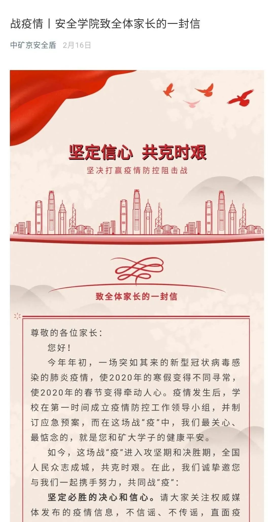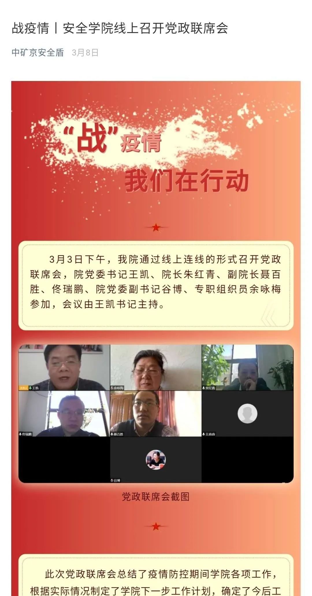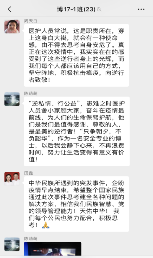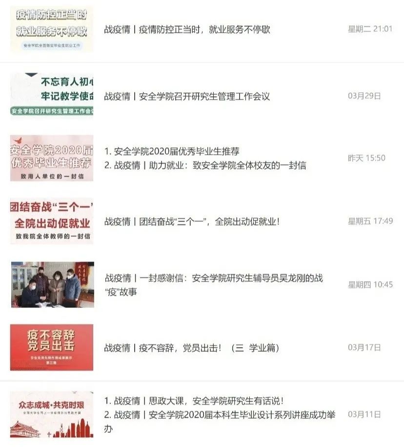 安全学院有针对性和时效性地发布最新举措,促使在这场抗疫情战争中,全院师生心往一块想,力往一处使,汇聚校内外资源和力量,共抗疫情。各年级辅导员召开学生、学生干部网络语音、视频会议20余次,统一思想认识,部署工作安排。发布推文“安全学院致全体家长的一封信”,构筑家校联动平台。发布推文“安全学院2020届优秀毕业生推荐”、“助力就业:致安全学院全体校友的一封信”携手用人单位、海内外校友“战疫情,稳就业”。