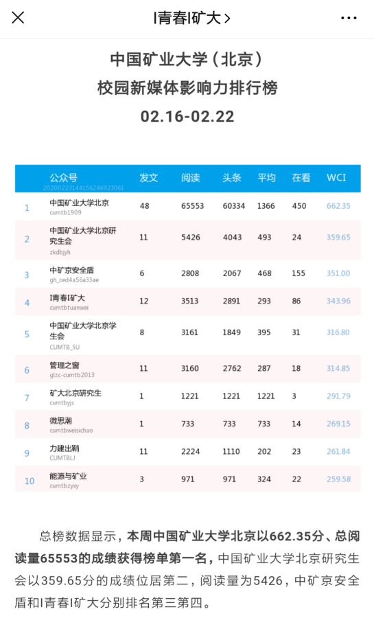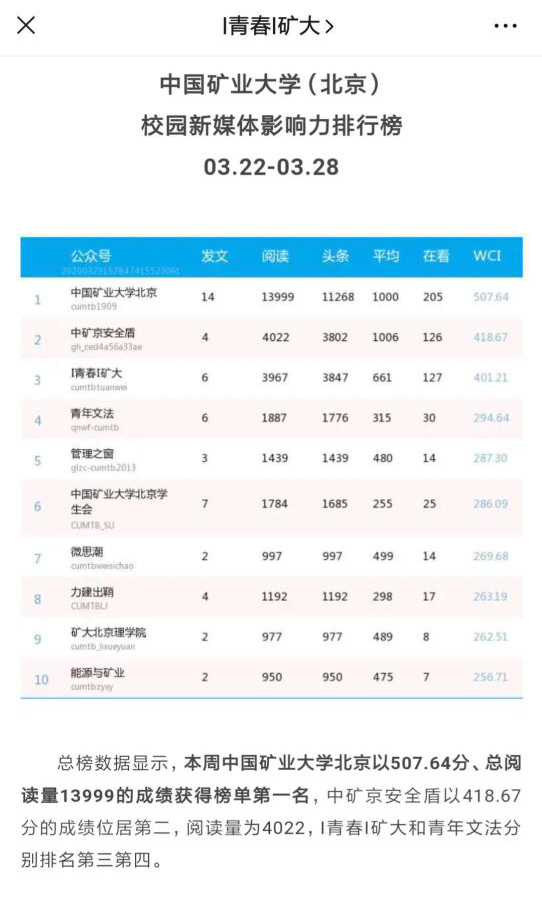 安全学院宣传思想战线以新冠肺炎疫情防控工作为重点,号召全院师生积极应对、科学防控,为坚决打赢疫情防控阻击战提供强有力的舆论支持。开展“战疫情”专题宣传,发布推文18篇,总浏览量已达9729,官方微信公众号“中矿京安全盾”多次进入校园新媒体影响力排行榜前三名。