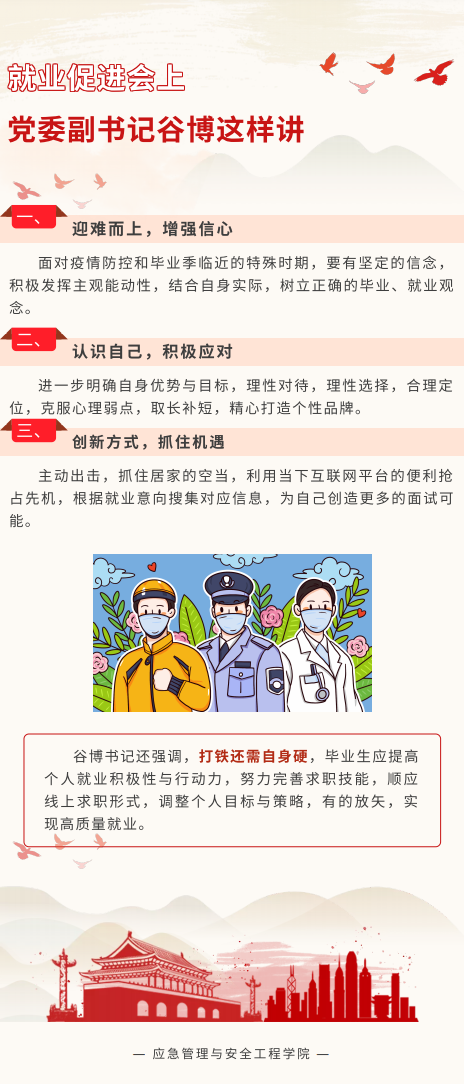 安全学院深入贯彻教育部、北京市与我校关于做好新冠肺炎疫情防控期间毕业生就业的各项工作要求,加强就业指导力度,扩大就业服务范围,落实全员参与,最大限度降低疫情对毕业生就业的影响。