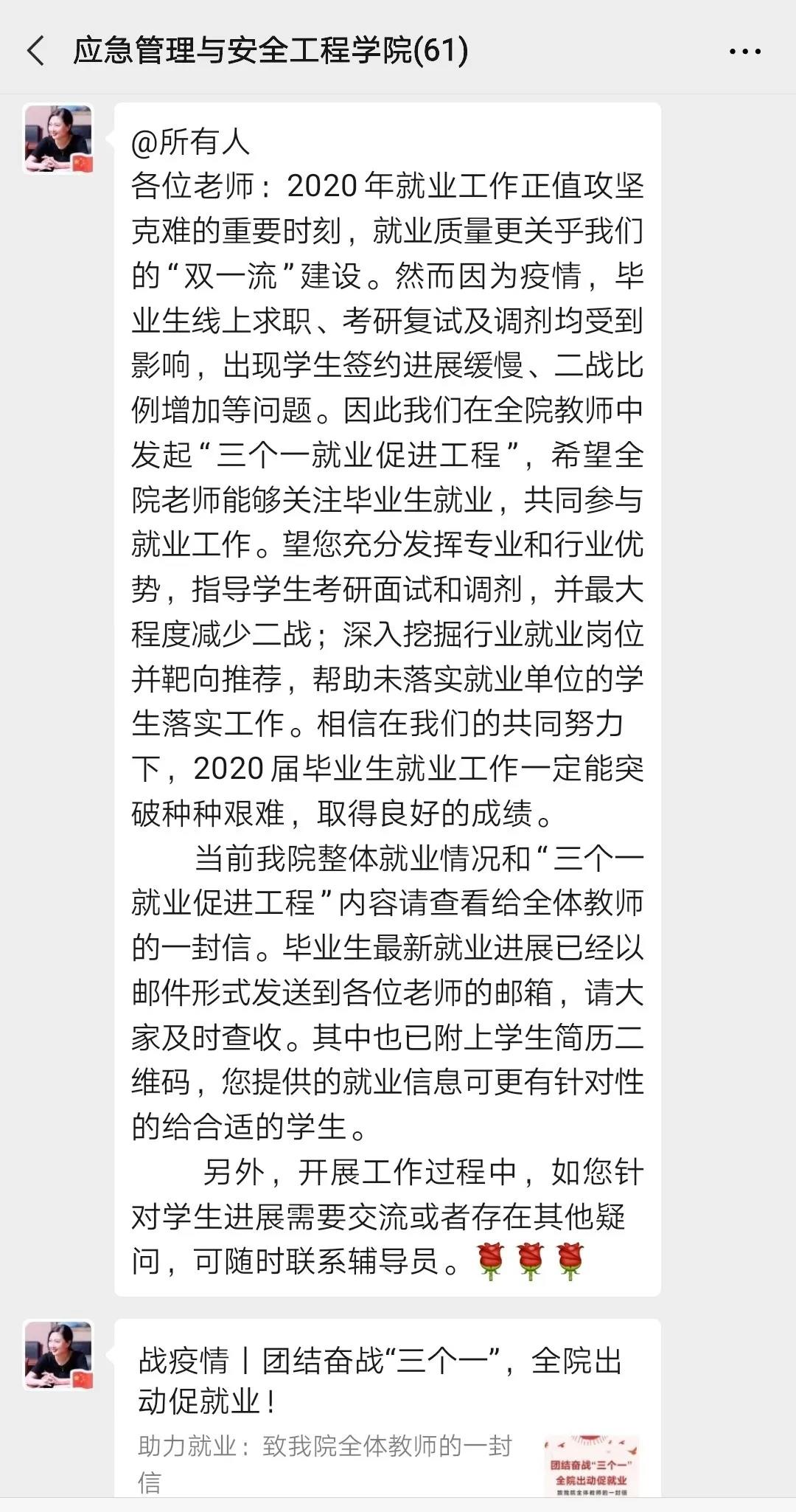 团队奋战“三个一”,全员出动促就业。安全学院建立“三个一就业促进工程”即“至少帮助联系一名学生调剂”、“提供至少一条就业信息”、“直接或间接帮助一个学生签约”,号召全体教师荐才。充分调动班主任、导师及校友的力量,挖掘更多行业内资源,定期向导师、班主任通报毕业生就业进展及就业困难学生信息,确保导师、班主任在促进学生升学、就业方面有抓手、有依据。同时学院分别发起致全体教师、全体校友及用人单位的一封信,提升毕业生吸引力,增加了学院荐才与用人单位选才的力度,促成 “人人关心学生就业,人人帮助学生就业”氛围。