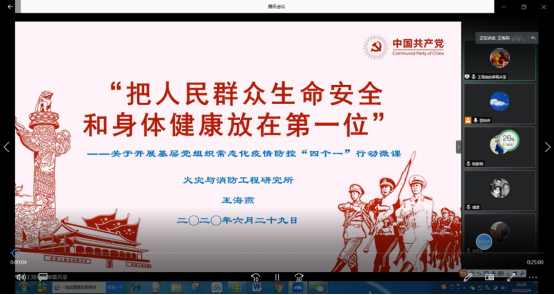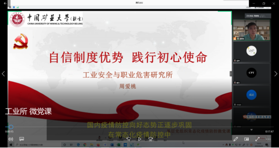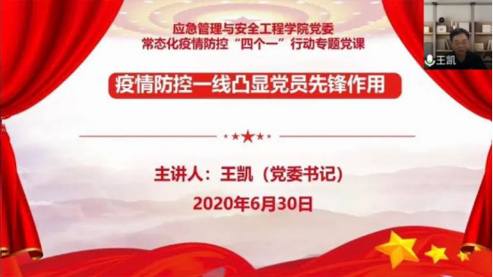 值此“七·一”建党节来临之际,为贯彻党中央、教育部党组关于常态化疫情防控的决策部署以及《中共中国矿业大学(北京)委员会关于开展基层党组织常态化疫情防控“四个一”行动的通知》,应急管理与安全工程学院党委书记王凯于2020年6月30日19:00,通过腾讯会议讲授了一堂题为《疫情防控一线凸显党员先锋作用》的线上微党课,此次活动共有270名师生党员及入党积极分子参加。