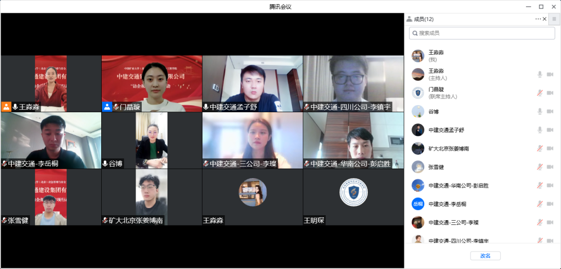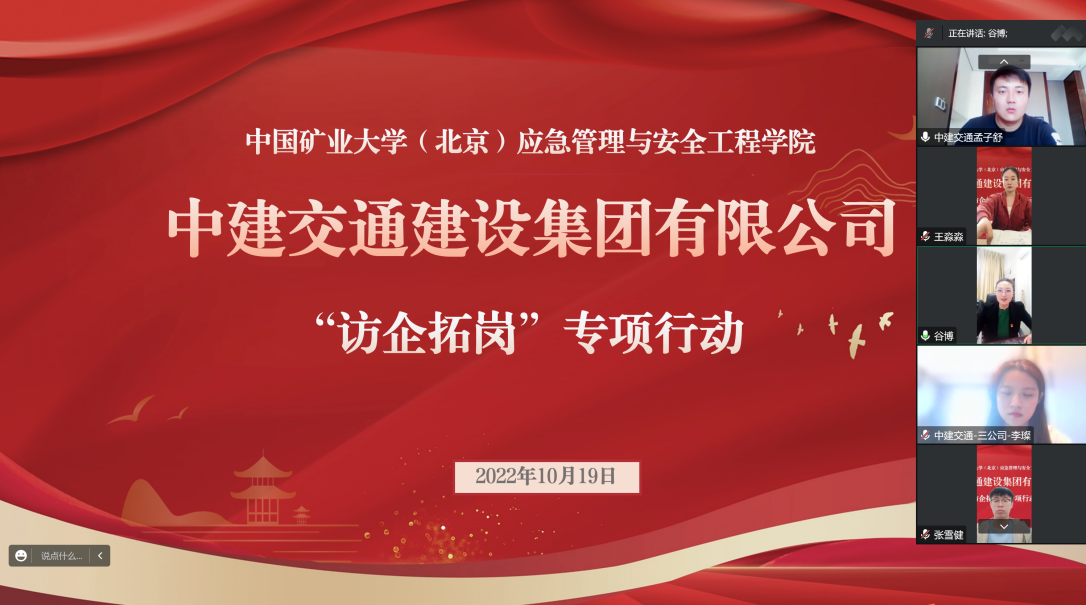 为深入贯彻落实党中央、国务院关于高校毕业生就业工作的决策部署,积极开展“访企拓岗”专项行动,多措并举全力推进我院毕业生更加充分更高质量就业,2022年10月19日,我院党委副书记谷博带领学工队伍,与中建交通建设集团有限公司通过线上座谈的方式,开展“访企拓岗”专项行动。中建交通建设集团有限公司招聘总监孟子舒出席活动。