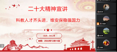 2022年12月13日,我院院长朱红青以“科教人才齐头进,维安保稳强国力”为题开展主题党课,进行二十大精神宣讲,全院300余名党员和积极分子线上聆听党课。