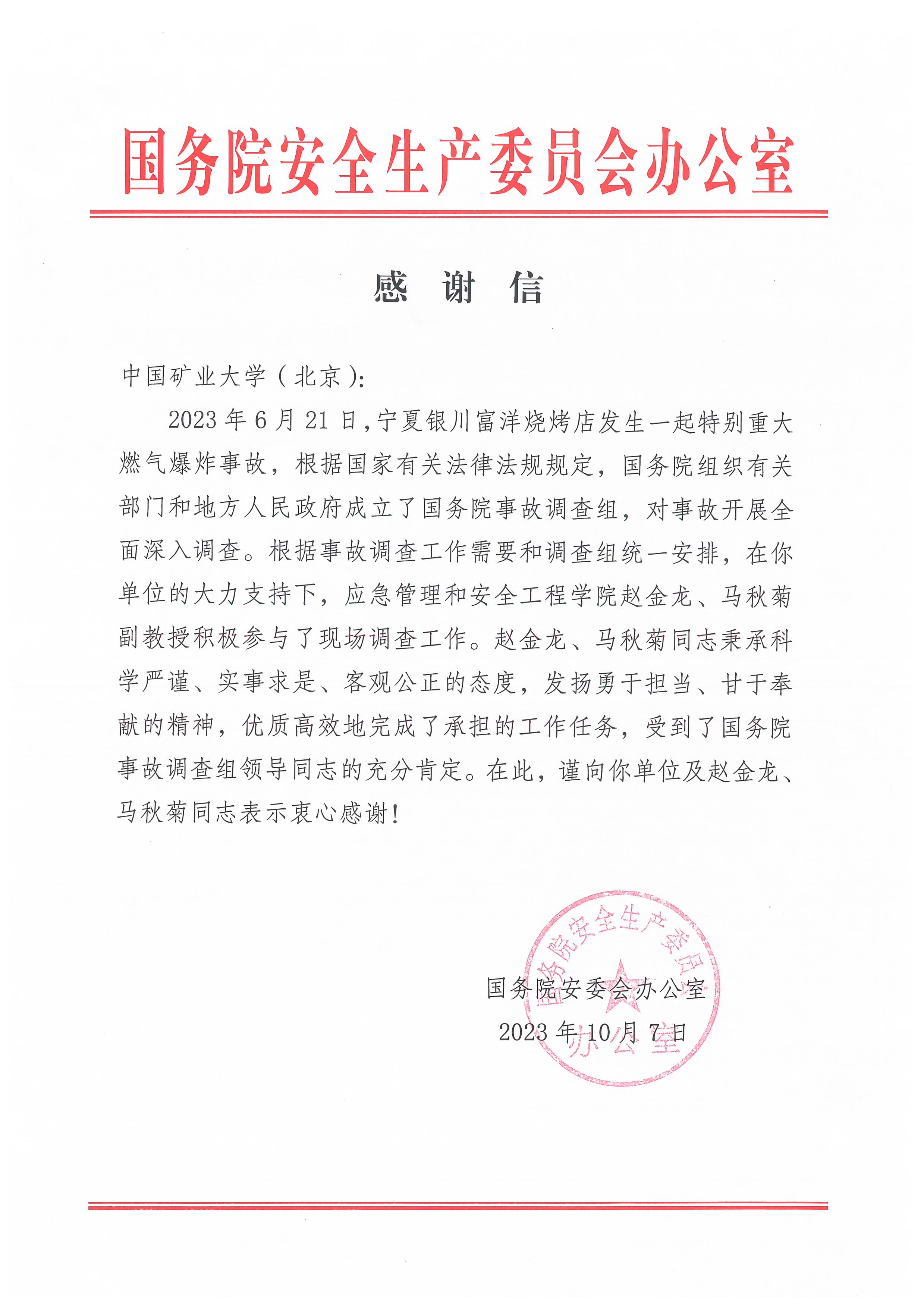 2023年10月7日,国务院安全生产委员会办公室给我校发来感谢信,感谢我校应急管理与安全工程学院赵金龙、马秋菊同志在宁夏银川富洋烧烤店“6·21”特别重大燃气爆炸事故调查工作中做出的贡献。