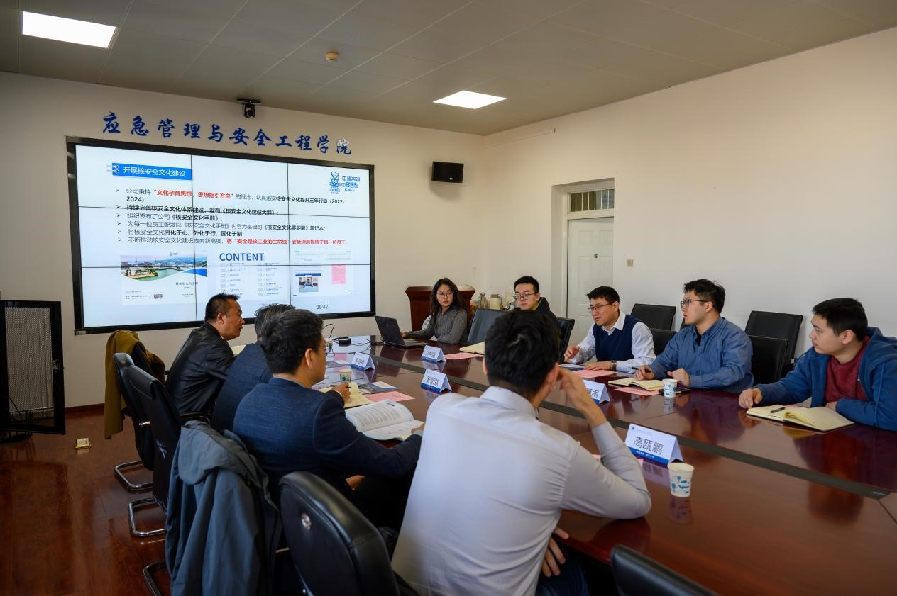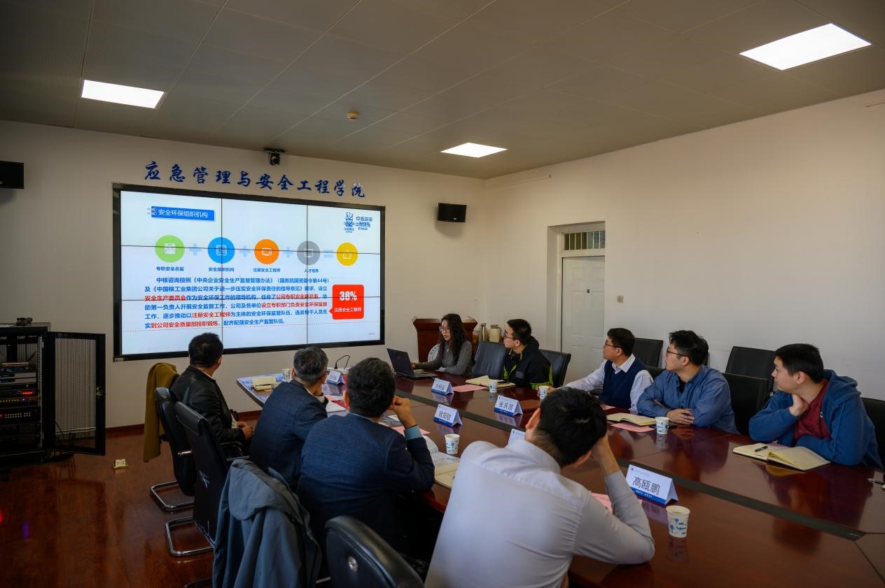 张庆国首先对中核工程咨询有限公司欧阳钦一行人的来访表示热烈欢迎。他介绍了学校、学院和安全学科的发展历程和历史脉络。学院现设有安全工程系、消防工程系、应急技术与管理系三个系别,每个系别都有其侧重的研究方向。近年来,学院深入贯彻落实党中央“完善大安全大应急框架下应急指挥机制”的指示精神,以传统煤矿安全、消防安全为主导,持续外延式发展。希望双方能够以此次交流为契机,进一步拓展核安全方面的相应业务和能力,从而实现双方互惠共赢。