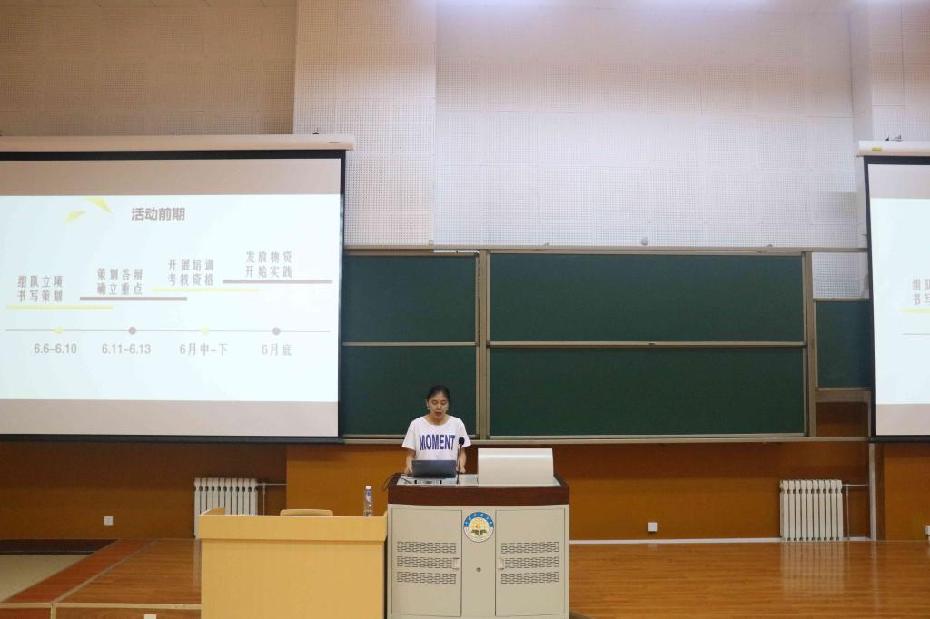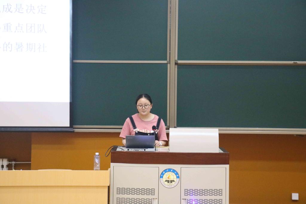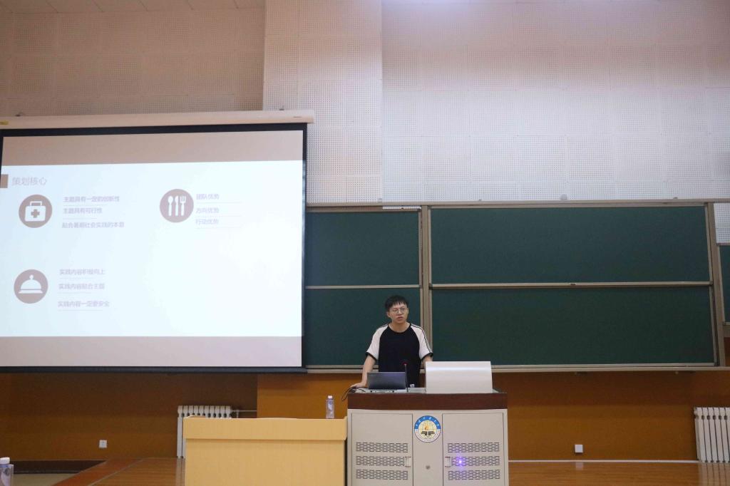 大会第一项策划培训,由王奕筝同学向大家讲解此次社会实践的几个重要时间节点其中应加以注意的是包括策划书的截止日期以及优秀候选团队答辩日期。“良好的策划是成功的开始”,策划书对于一个实践团队是必不可少的。为了让同学们写好策划,毛馨悦同学为大家做了社会实践策划培训。她从策划书的重要性及要求两方面加以介绍。她在会议中指出,撰写策划书的过程是团队深入了解和统筹规划整个实践活动的过程。因此,策划书的好坏将直接反映出一个团队对于主题的把握和了解程度。另外,策划书同时也是后期优秀实践队评比的重要依据,其重要程度不亚于最终的实践报告。在策划书的要求方面,她着重在策划书的格式及应具有的相关内容上加以介绍。