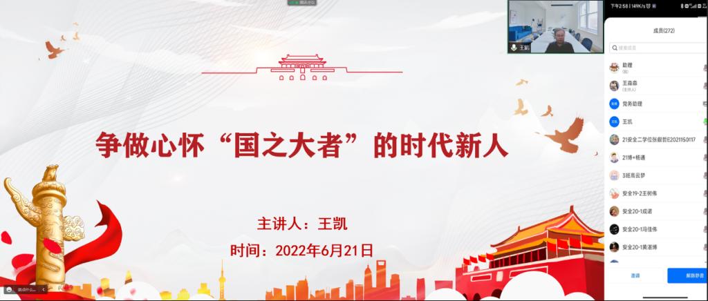 2022年6月21日,我院党委书记王凯为全院师生讲授“争做心怀‘国之大者’的时代新人”主题党课,全院近300名党员和积极分子线上聆听党课。