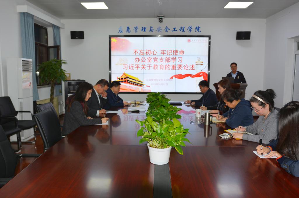 10月17日下午,我院办公室党支部在综合楼707召开了“不忘初心、牢记使命”主题教育学习心得交流会。本次会议由办公室党支部副书记陈斌主持,支部党员朱红青、王凯、佟瑞鹏、聂百胜、余咏梅、谷博、王毅、门晶璇参加会议。