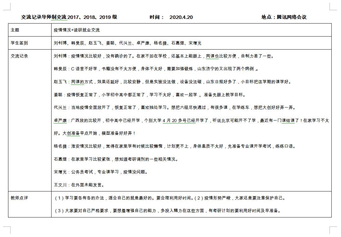 答疑解惑,以学业进程变化为主题,将师生交流建立在有效的解决问题上。教师的第一要务是传道授业解惑,本科生导师也一样。学生四年的学习生涯中会面临大学自主式学习方式的转变、专业方向选择、考研就业抉择等等问题,以学业进程变化为主题的交流活动,在有效解决学生疑惑的过程中可以达到很好的指导时效和实效。比如:采用推荐观看英国记录十四个孩子的不同人生的纪录片-《56up》,以主题会议交流探讨的方式激发学生尽早投入到学习中的热情;采用高年级学生与低年级学生相互答疑解决学习方式转变和专业方向的选择问题,并邀请优秀学生分享经验;采用介绍课题组已毕业的师兄弟从哪个学校来、读研后到什么岗位上去的交流主题解决考研和就业抉择的问题。