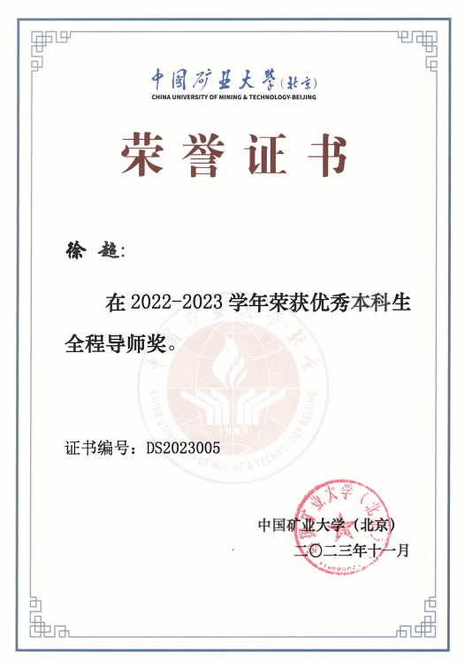 徐超老师始终坚持贯彻落实立德树人根本任务,坚守“为党育人、为国育才”初心使命,注重师德师风建设,按照四有好老师、四个引路人标准,努力做塑造学生品格、品行、品味的“大先生”。目前共指导47名本科生,其中近三年指导32名,构建了“以导师为主导,研究生辅导本科生、高年级本科生辅导低年级本科生”的纵向链式学习科研团队,根据不同学生特点、不同学习阶段分别制定具体的指导计划,在学业规划、专业辅导、科研探索以及品德培育等方面实施全过程、定制化、个性化指导。