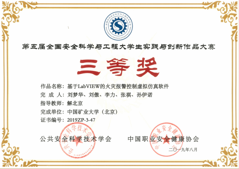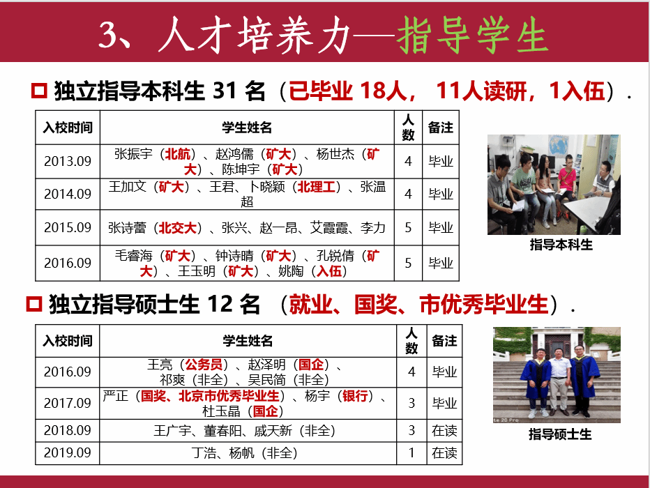 解北京老师的第一届本科生导师制学生是2013级,是学校试点的第一届学生,截至2019级共指导31名学生,毕业的学生中11人攻读硕士学位,1人入伍。读研的学校包括:北京航天航空大学、北京理工大学、北京交通大学、中国矿业大学(北京)、中国矿业大学。指导本科生导师学生发表核心论文1篇、获得第五届全国安全科学与工程大学生实践与创新作品大赛三等奖1项、授权实用性专利3项:一种集束式电缆井火情探测线缆(ZL201922274049.7)陈安东(学生排名1)、一种建筑物电缆井火情探测装置(ZL201922278478.1)陈安东(学生排名1)、一种用于SHPB动态标定的组合式传感器端部安装装置(ZL201922144592.5)张祺(学生排名1)。