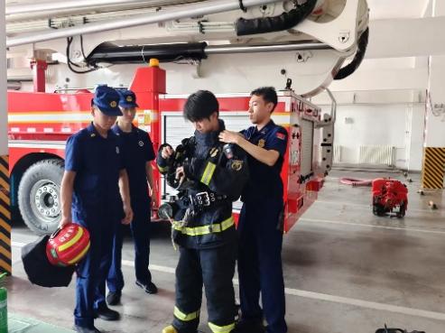 随后,队员们来到训练场,了解消防员的日常训练内容。消防员展示了快速穿着灭火防护服、空气呼吸器佩戴等基本技能,并邀请同学们亲身体验。尽管消防服厚重且装备繁琐,多位同学仍在指导下成功完成了穿戴。